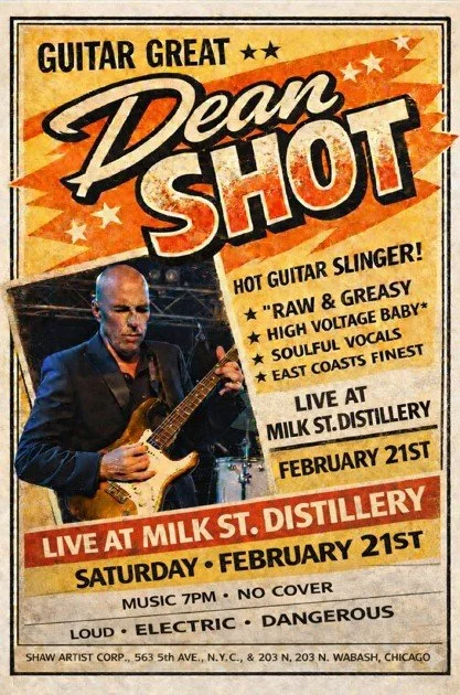 The Dean Shot trio performs a wide range of early American music 1950s and 1960s (Blues, Jump, Rock & Roll, Rockabilly, Surf and much more) both traditional songs and originals in a highly dynamic and well received style.